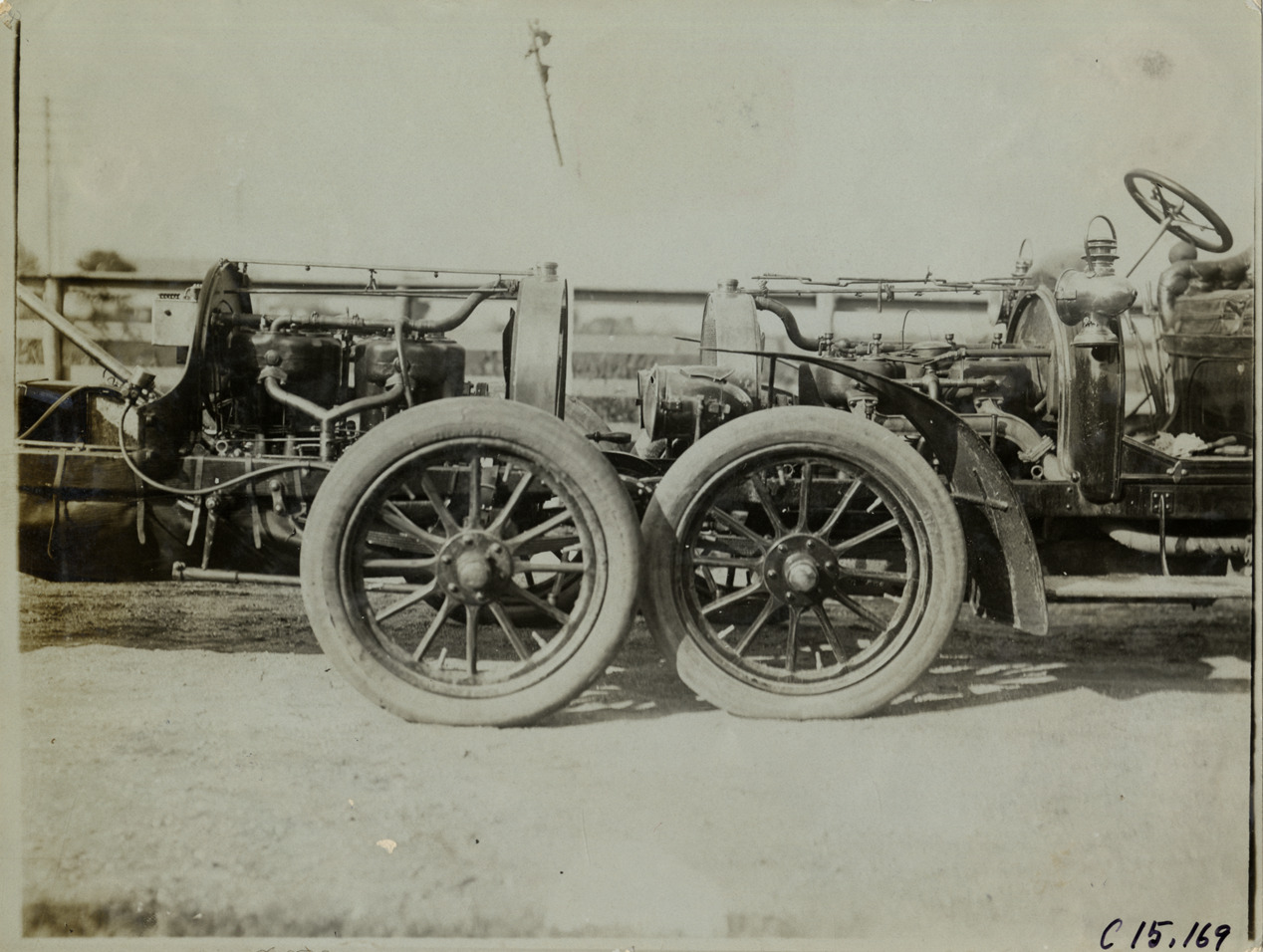 Close-up view of two cars facing each other, showing engines, during the 1905 Vanderbilt Cup races on Long Island, New York. Stamped on back: "Photo by F. Ed. Spooner, 1536 B'way, telephone 6536-38th St., New York, N.Y." Handwritten on back: "Races and racing--Vanderbilt Cup races, 1905."