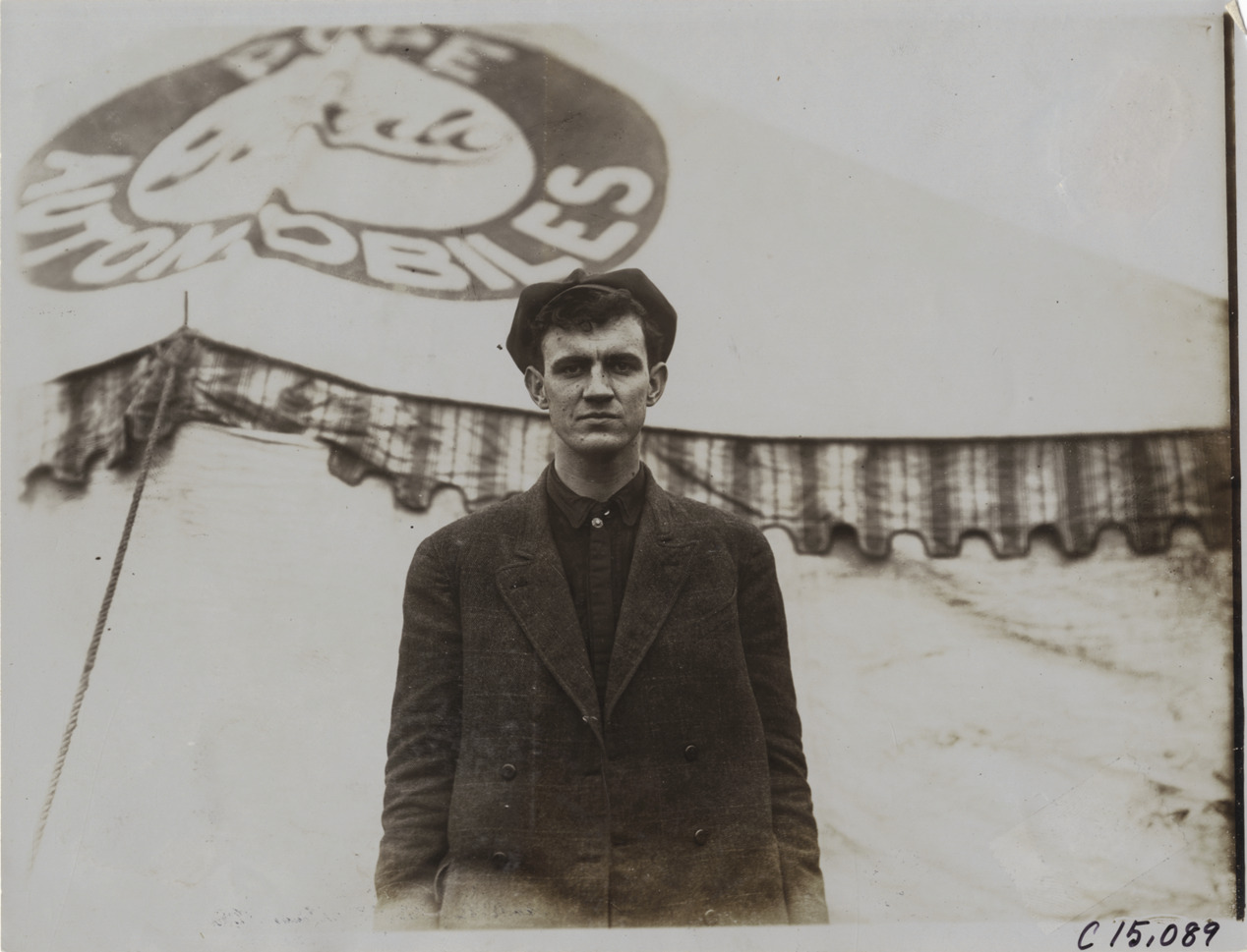 Man posing in front of Pope-Toledo tent, 1905 Vanderbilt Cup races