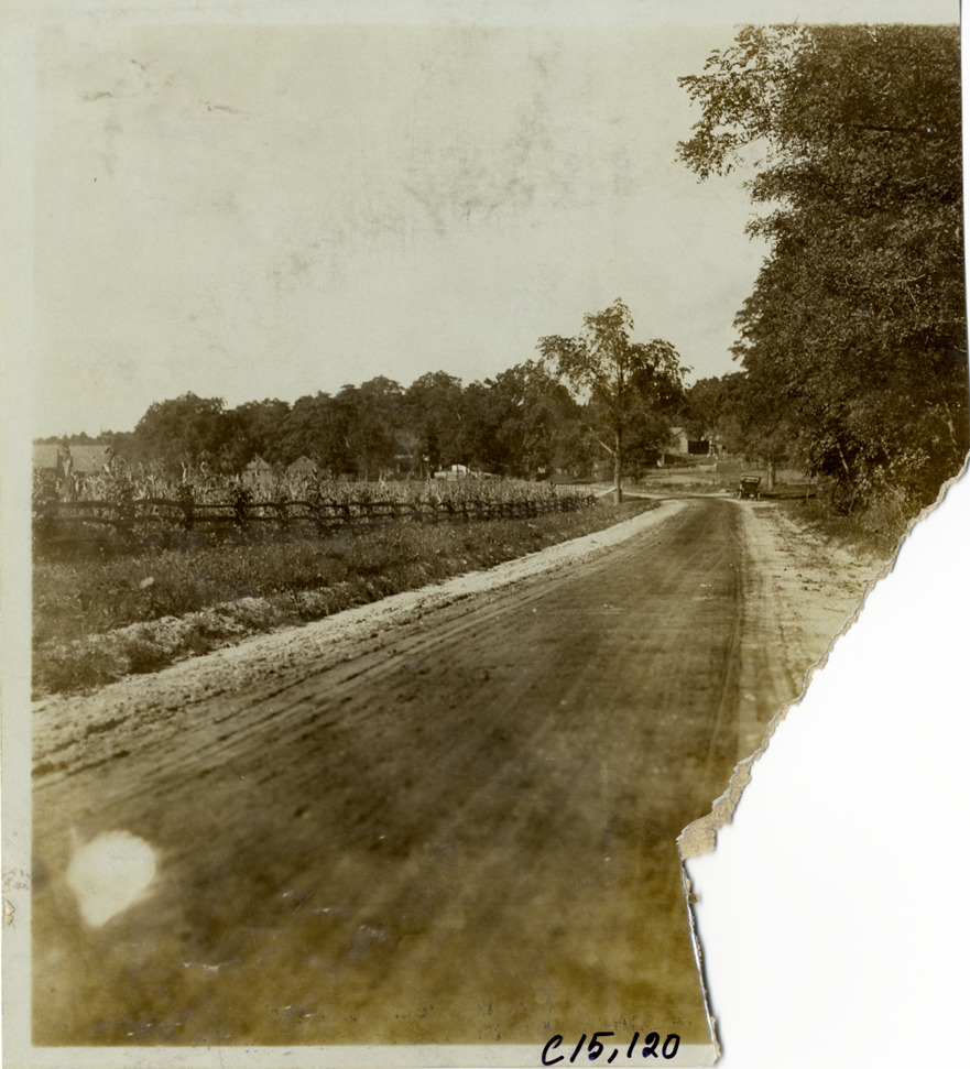 Rear view of car parked on side of rural dirt road, part of the course for the 1905 Vanderbilt Cup races on Long Island, New York. Cornfield on left. Handwritten on back: "Part of the course. Races and racing--Vanderbilt Cup races, 1905."