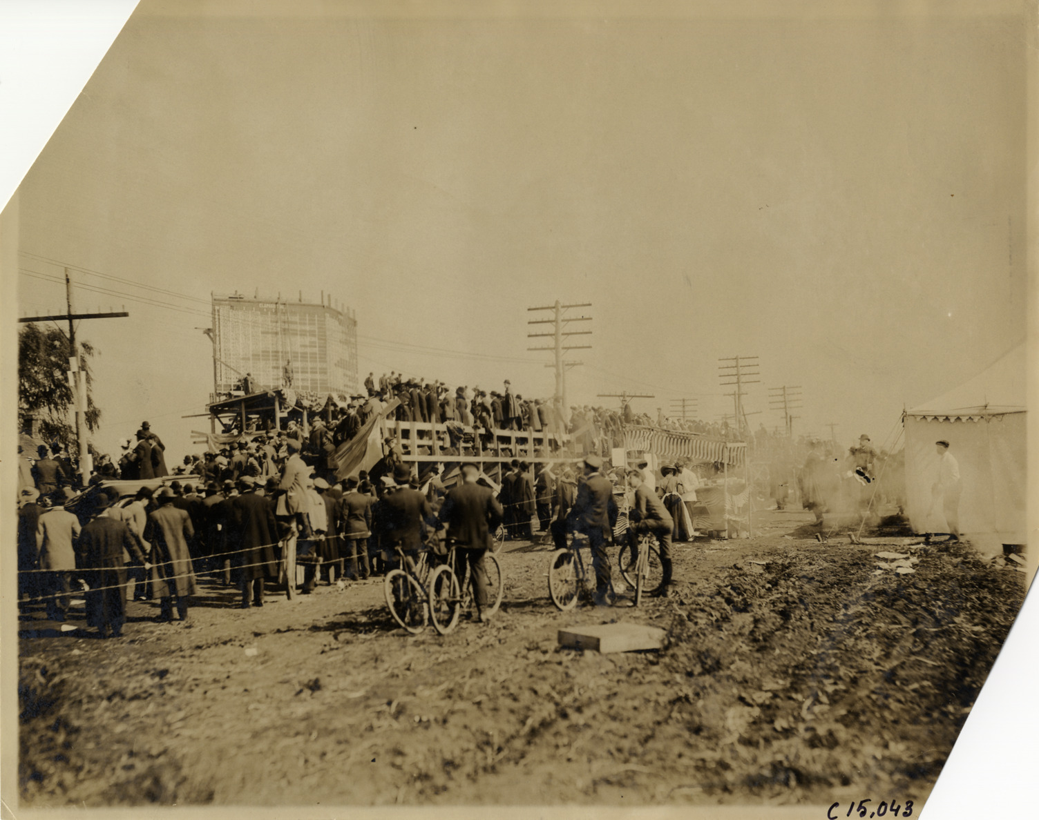 Rear view of spectators in grandstand during the 1905 Vanderbilt Cup races on Long Island, New York. Men with bicycles in foreground; scoreboard in background. Handwritten on back: "Races and racing--Vanderbilt Cup races, 1905."