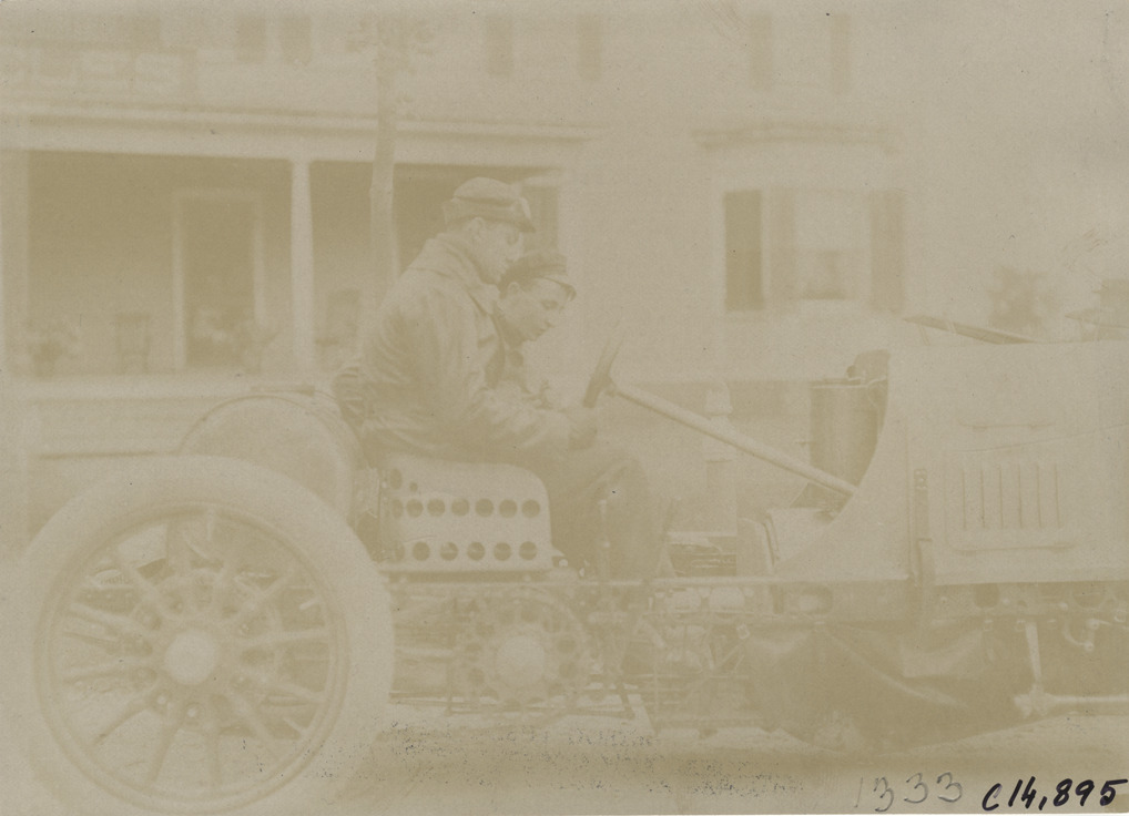 View of driver Frank Croker and passenger in Simplex car during the 1904 Vanderbilt Cup races on Long Island, New York. Handwritten on back: "#17 75 h.p. Simplex, driven by Frank Croker. Races and racing--Vanderbilt Cup races, 1904."