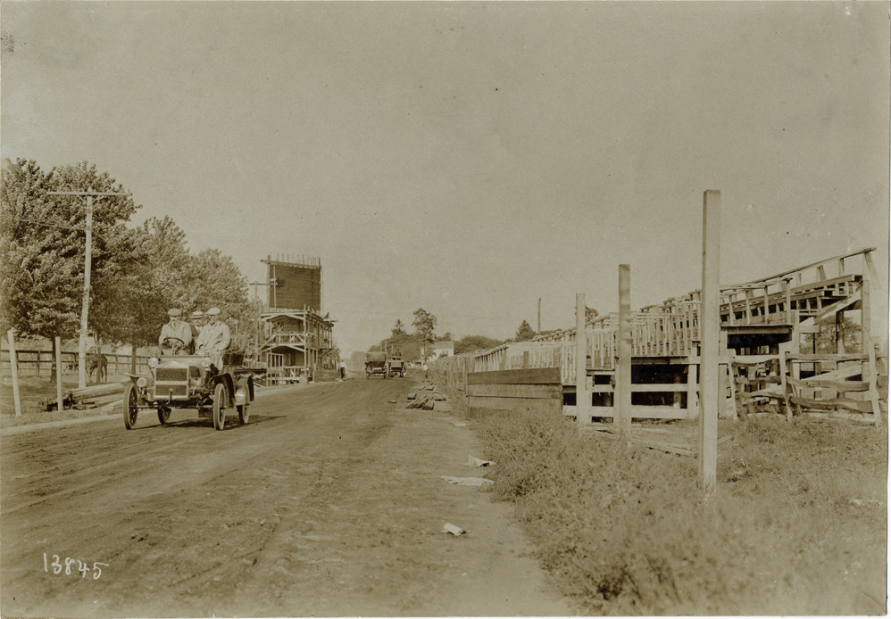 Motorists traveling past grandstand under construction, 1906 Vanderbilt Cup races