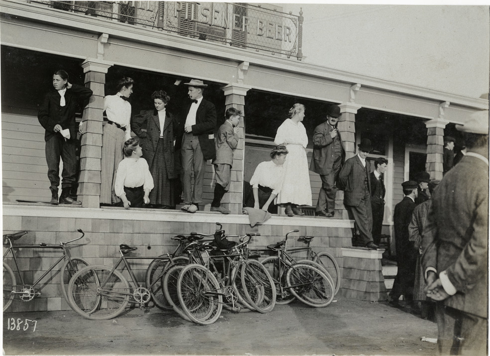 View of spectators watching race from porch during the 1906 Vanderbilt Cup races on Long Island, New York. Several bicycles in foreground; "Pilsner beer" sign is displayed over porch. Handwritten on back: "Races and racing--Vanderbilt Cup races, 1906."