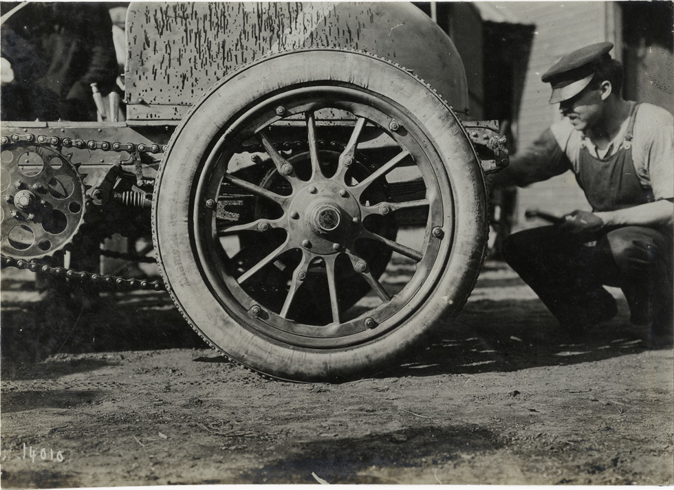 Close-up view of man crouching next to wheel and tire for Thomas Flyer car during the 1906 Vanderbilt Cup races on Long Island, New York. Cap on wheel reads: "E.R. Thomas Motor Co., Thomas Flyer." Handwritten on back: "Races and racing--Vanderbilt Cup races, 1906."