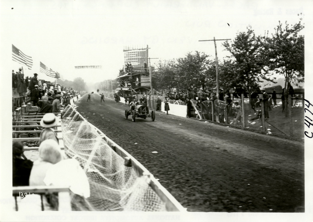 View of Hugh Harding and passenger racing Haynes car no. 14 in elimination run during the 1905 Vanderbilt Cup races on Long Island, New York. Handwritten on back: "Elimination run, #14 Haynes, driven by Harding. Races and racing--Vanderbilt Cup races, 1905."