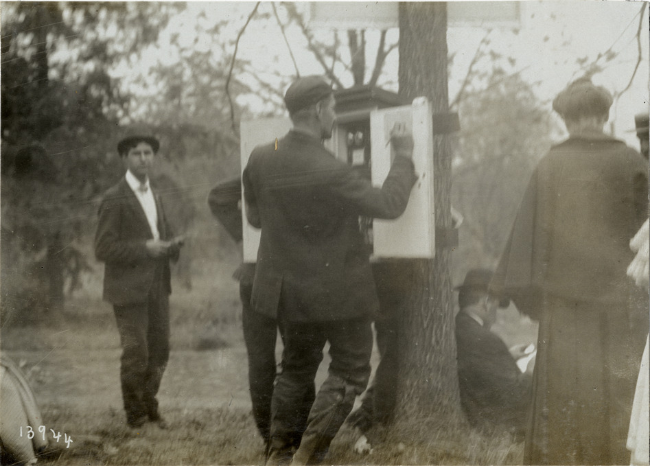 View of man making telephone call at box attached to tree during the 1906 Vanderbilt Cup races on Long Island, New York. Several men stand nearby. Stamped on back: "Photo by N. Lazarnick, 29 West 42nd Street, New York." Handwritten on back: "Races and racing--Vanderbilt Cup races, 1906."