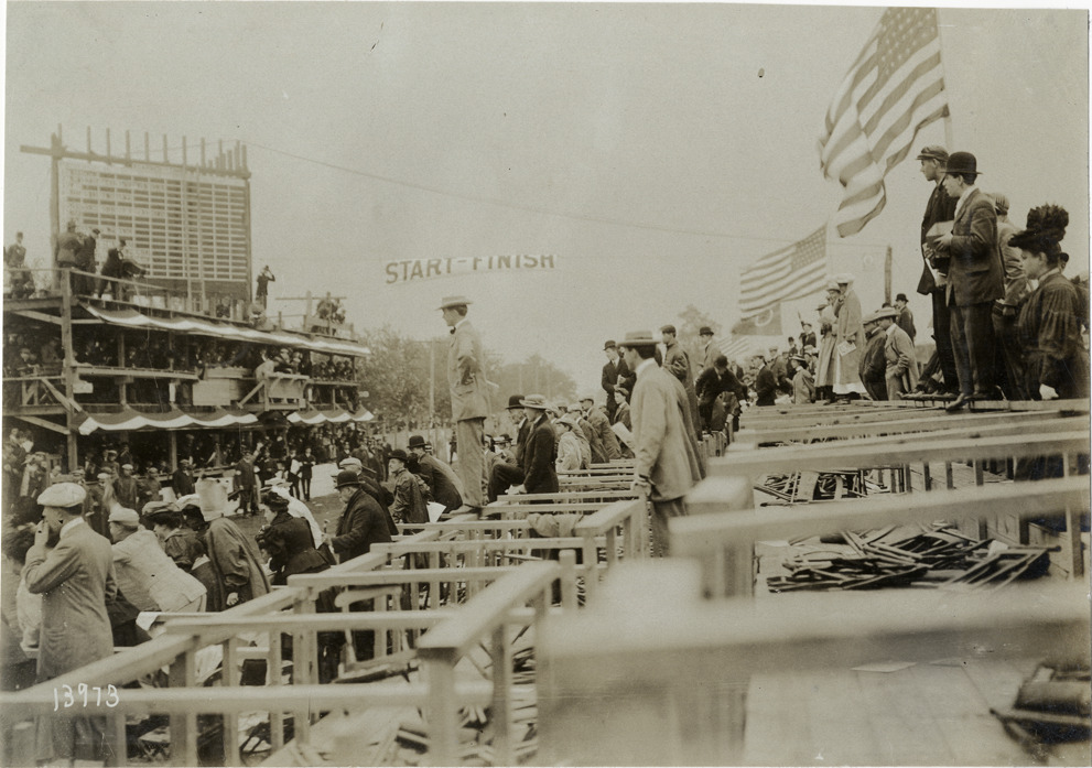 View of spectators in grandstand during the 1906 Vanderbilt Cup races on Long Island, New York. "Start-Finish" banner in background. Stamped on back: "Photo by N. Lazarnick, 29 West 42nd Street, New York." Handwritten on back: "Races and racing--Vanderbilt Cup races, 1906."