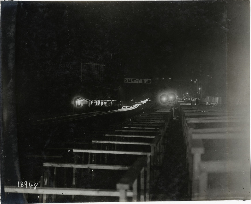 Nighttime view of scoreboard, officials' stand, timers' stand and press box during the 1906 Vanderbilt Cup races on Long Island, New York. Bleachers in foreground; "Start-Finish" banner in background. Stamped on back: "Photo by N. Lazarnick, 29 West 42nd Street, New York." Handwritten on back: "Races and racing--Vanderbilt Cup races, 1906."