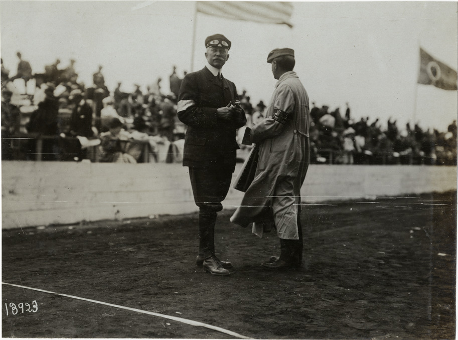View of chairman Jefferson De Mont Thompson and racing official standing in front of bleachers during the 1906 Vanderbilt Cup races on Long Island, New York. Handwritten on back: "Races and racing--Vanderbilt Cup races, 1906."
