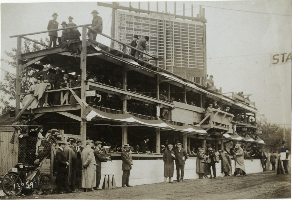 Scoreboard, officials' stand, timers' stand and press box, 1906 Vanderbilt Cup races