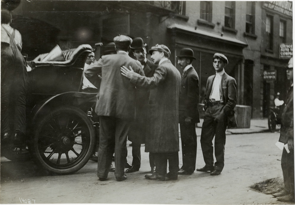 View of driver Albert Clement and group of men standing in street next to car during the 1906 Vanderbilt Cup races on Long Island, New York. Stamped on back: "Photo by N. Lazarnick, 29 West 42nd Street, New York." Handwritten on back: "Albert Clement. Races and racing--Vanderbilt Cup races, 1906."