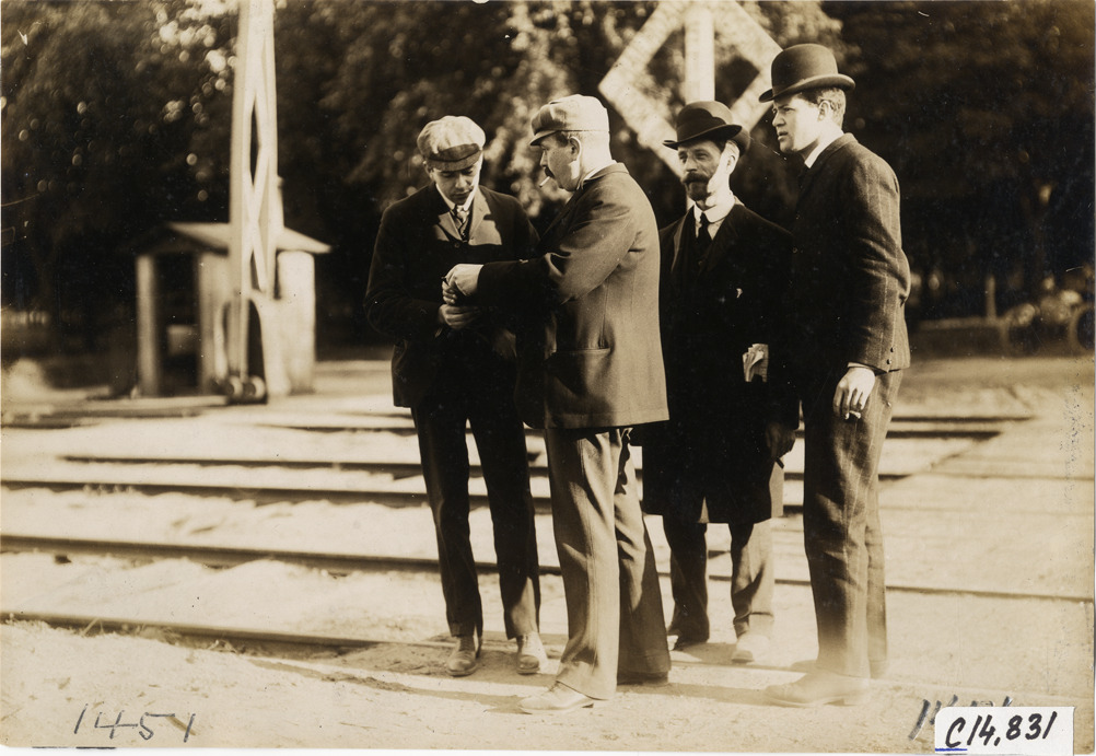Men at railroad crossing, 1906 Vanderbilt Cup races