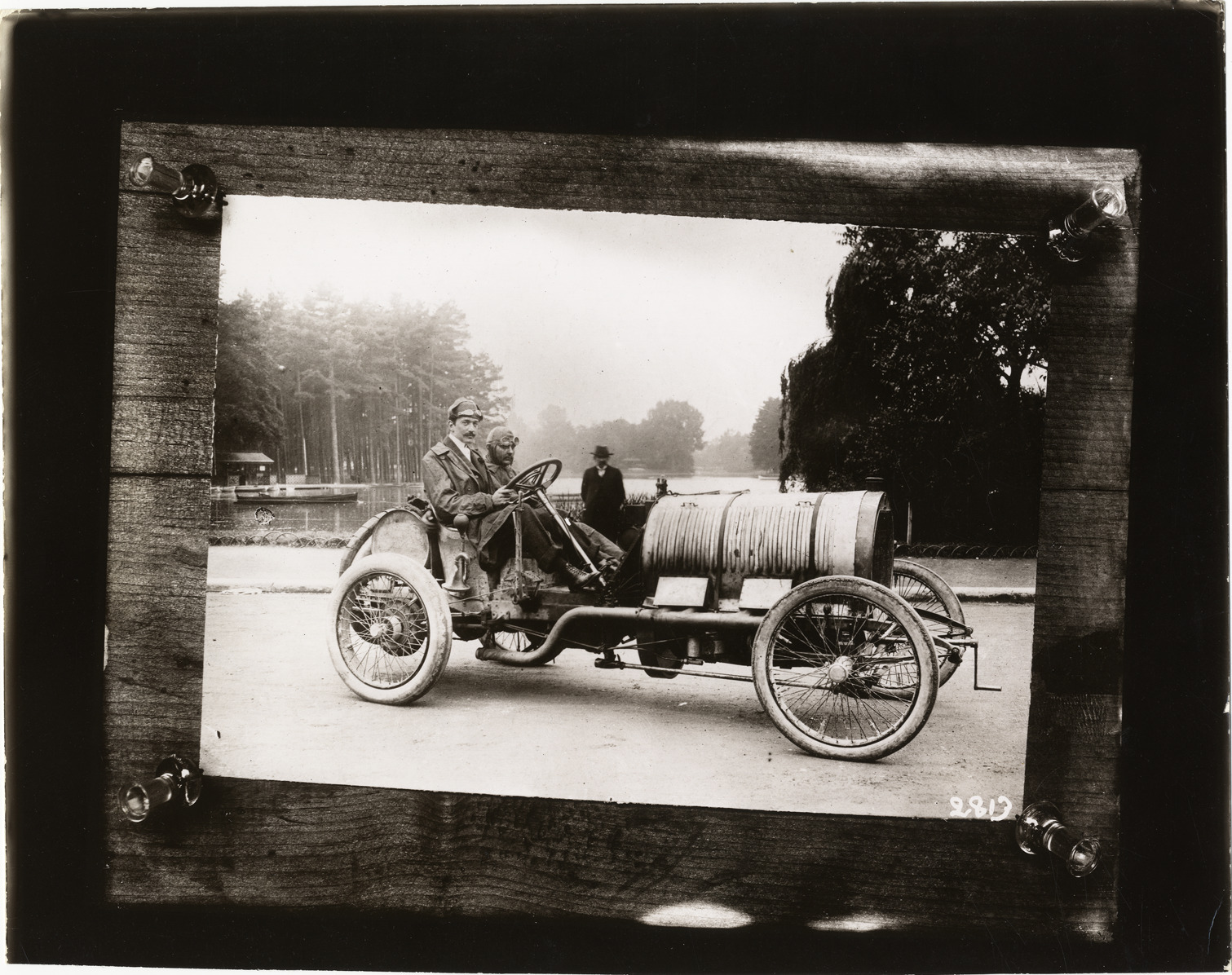 View of Elliott Shepard and passenger posing in Hotchkiss car during the 1906 Vanderbilt Cup races on Long Island, New York. Stamped on back: "Photographic illustration by Nick Lazarnick, 230 Park Ave., N.Y." Handwritten on back: "French Hotchkiss car; Elliott Shepard at wheel of Hotchkiss, Vanderbilt, 1906. Races and racing--Vanderbilt Cup races, 1906."