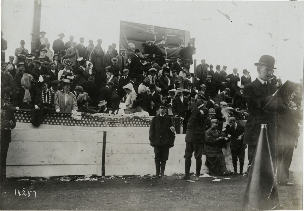 View of map of course in crowded grandstand during the 1906 Vanderbilt Cup races on Long Island, New York. Announcer Peter Prunty in foreground with megaphone. Stamped on back: "Photo by N. Lazarnick, 29 West 42nd Street, New York." Handwritten on back: "Map on the grandstand by which spectators followed the race. Races and racing--Vanderbilt Cup races, 1906."