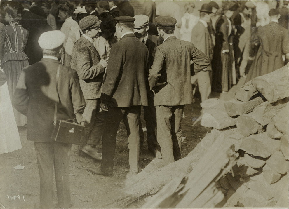 View of drivers Hubert Le Blon and Albert Clement conversing with two unidentified men during the 1906 Vanderbilt Cup races on Long Island, New York. Stamped on back: "Photo by N. Lazarnick, 29 West 42nd Street, New York." Handwritten on back: "Clement and Le Blon talking. Races and racing--Vanderbilt Cup races, 1906."