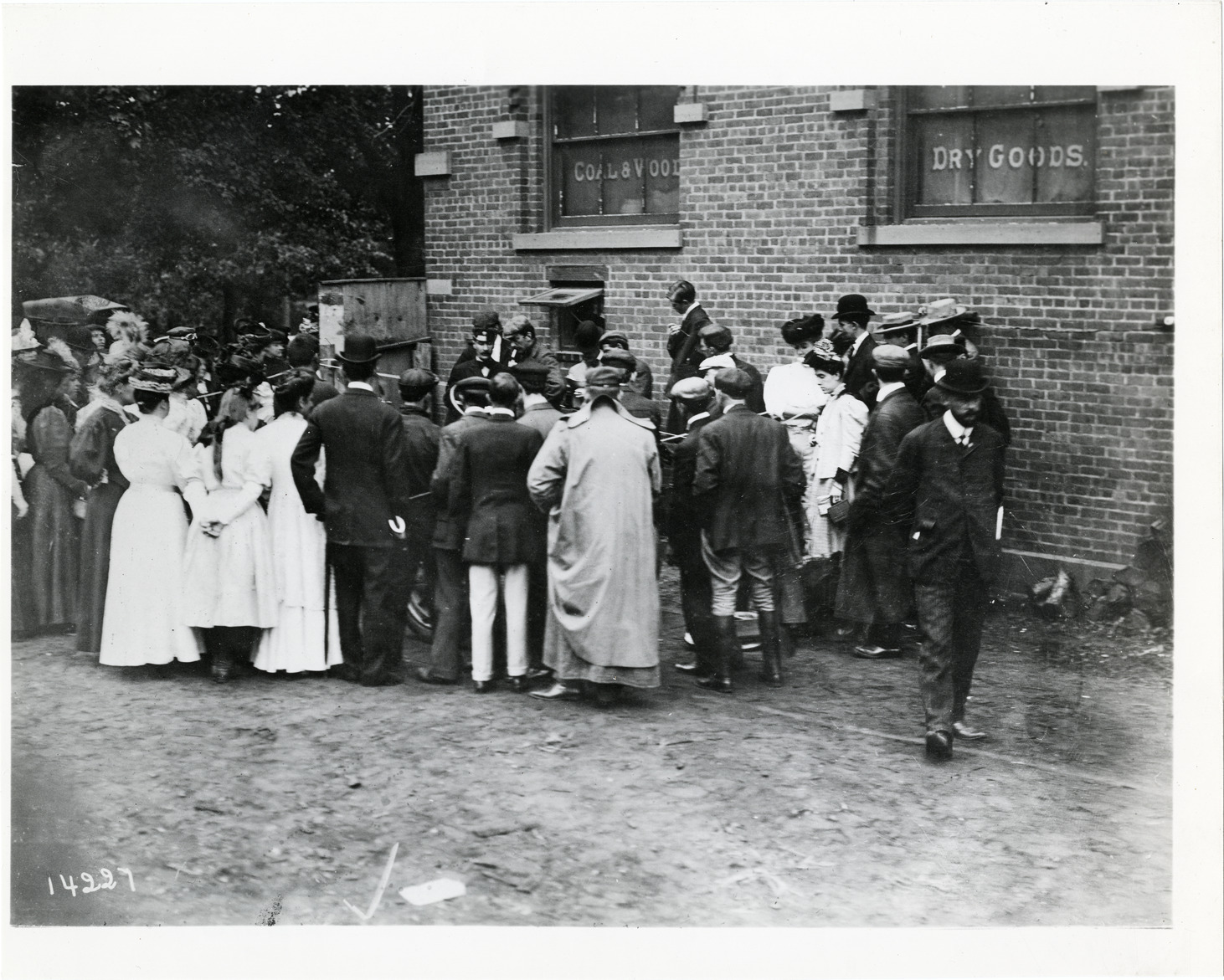 View of crowd surrounding car during the 1906 Vanderbilt Cup races on Long Island, New York. Brick commercial building in background. Handwritten on back: "Races and racing--Vanderbilt Cup races, 1906."
