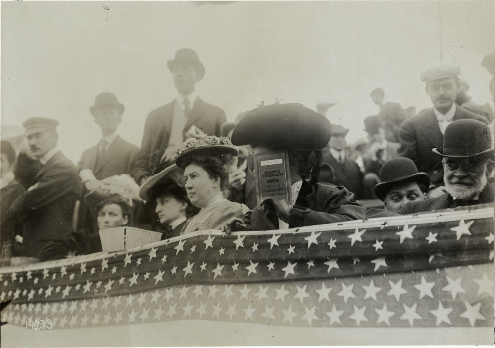 Close-up view of spectators in grandstand during the 1906 Vanderbilt Cup races on Long Island, New York. Women in front row holds program. Handwritten on back: "Races and racing--Vanderbilt Cup races, 1906."