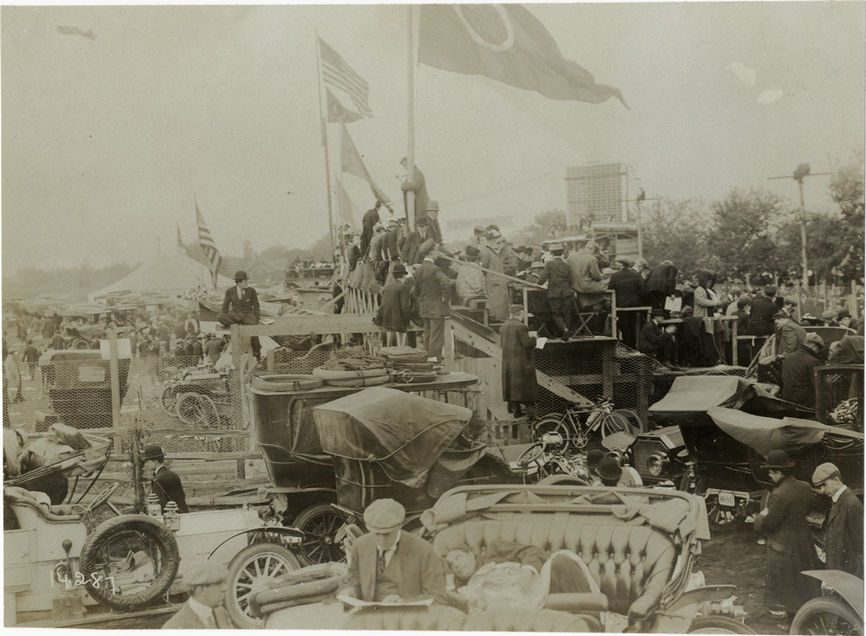 Favorite this☆ Grandstand, 1906 Vanderbilt Cup races Description: Side view of spectators in grandstand during the 1906 Vanderbilt Cup races on Long Island, New York. Cars are parked in back of grandstand; scoreboard in background. Handwritten on back: "Races and racing--Vanderbilt Cup races, 1906." Details Resource ID: na015792 Subject: Grandstands--New York (State)--Long Island Automobile racing fans--New York (State)--Long Island Automobiles--New York (State)--Long Island Vanderbilt Cup Race (1906) Automobile racing--New York (State)--Long Island Photographic prints Date Issued: 1906 Format: 1 photographic print ; 4.75 x 6.5 in. Member of: National Automotive History Collection Lazarnick Collection Filing Location: Races and racing--Vanderbilt Cup Races, 1906 #5 Rights: Physical rights are retained by DPL. Copyright is retained in accordance with U.S. copyright laws.
