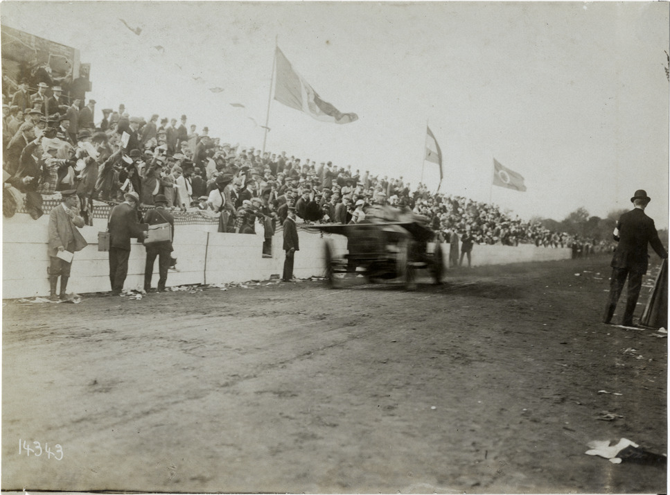 View of driver and passenger in car no. 3 in front of crowded grandstand during the 1906 Vanderbilt Cup races on Long Island, New York. Stamped on back: "Photo by N. Lazarnick, 29 West 42nd Street, New York." Handwritten on back: "Races and racing--Vanderbilt Cup races, 1906."