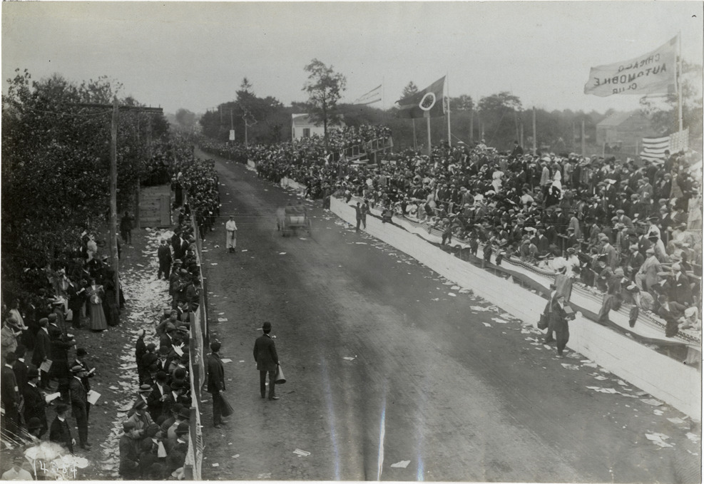 Rear view of driver and passenger racing car no. 7 past spectators during the 1906 Vanderbilt Cup races on Long Island, New York. Chicago Automobile Club flag on right. Stamped on back: "Photo by N. Lazarnick, 29 West 42nd Street, New York." Handwritten on back: "Races and racing--Vanderbilt Cup races, 1906."
