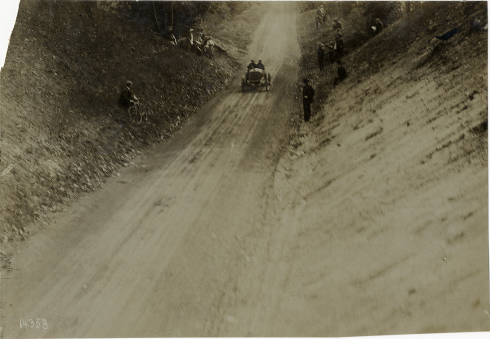 View of driver and passenger racing car no. 15 during the 1906 Vanderbilt Cup races on Long Island, New York. Handwritten on back: "Races and racing--Vanderbilt Cup races, 1906."
