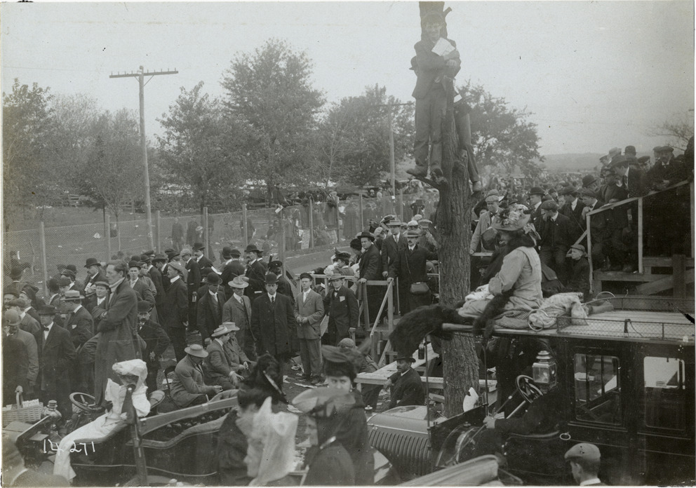 View of spectators on roadside during the 1906 Vanderbilt Cup races on Long Island, New York. Two men perch on tree; spectators with cars in foreground. Stamped on back: "Photo by N. Lazarnick, 29 West 42nd Street, New York." Handwritten on back: "Races and racing--Vanderbilt Cup races, 1906."