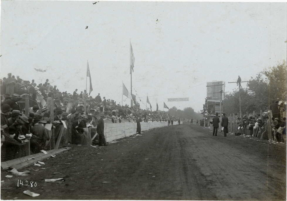 View of course in front of crowded grandstand during the 1906 Vanderbilt Cup races on Long Island, New York. Scoreboard and "Start-Finish" banner in background. Stamped on back: "Photo by N. Lazarnick, 29 West 42nd Street, New York." Handwritten on back: "Races and racing--Vanderbilt Cup races, 1906."