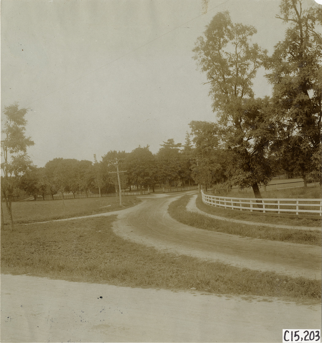 View of rural dirt road, part of the course for the 1906 Vanderbilt Cup races on Long Island, New York. Handwritten on back: "Elimination. Races and racing--Vanderbilt Cup races, 1906."