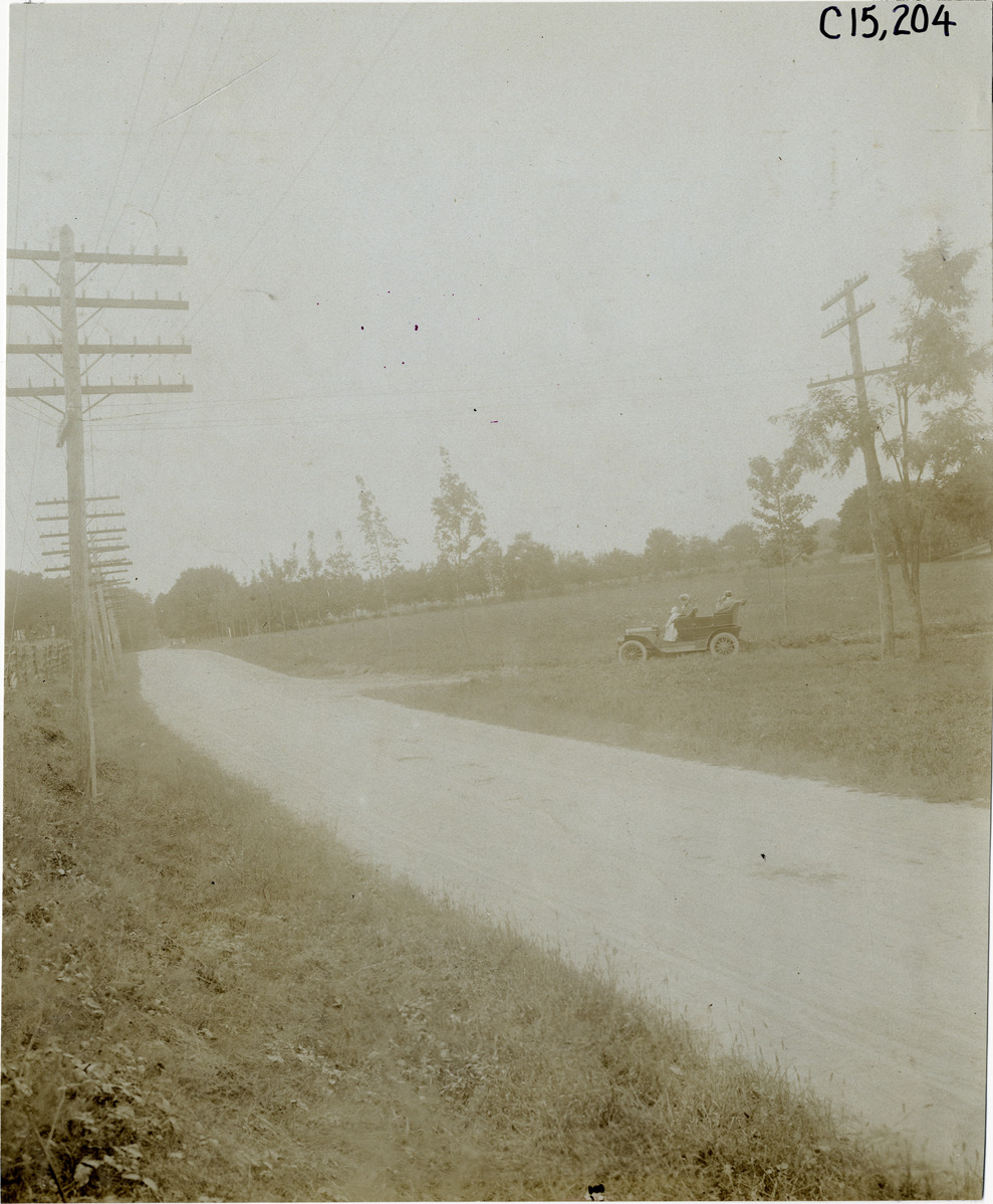 View of motorists in car traveling on rural dirt road, part of the course for the 1906 Vanderbilt Cup races on Long Island, New York. Stamped on back: "Photo by Spooner and Wells, 1536 Broadway, New York. Duplicates any time, any quantities, enlargements any size this plate." Handwritten on back: "Elimination. Races and racing--Vanderbilt Cup races, 1906."
