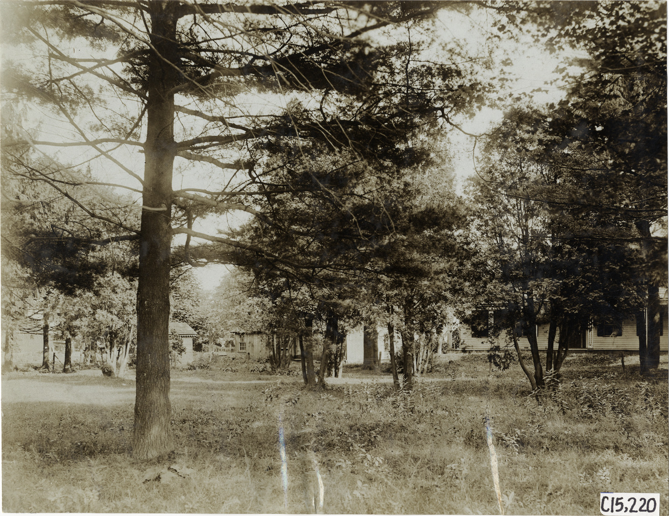 View of wooden-frame house and outbuildings, the site of the Maxwell headquarters, during the 1906 Vanderbilt Cup races on Long Island, New York. Buildings are partially obscured by trees. Handwritten on back: "Elimination, Maxwell headquarters. Races and racing--Vanderbilt Cup races, 1906."