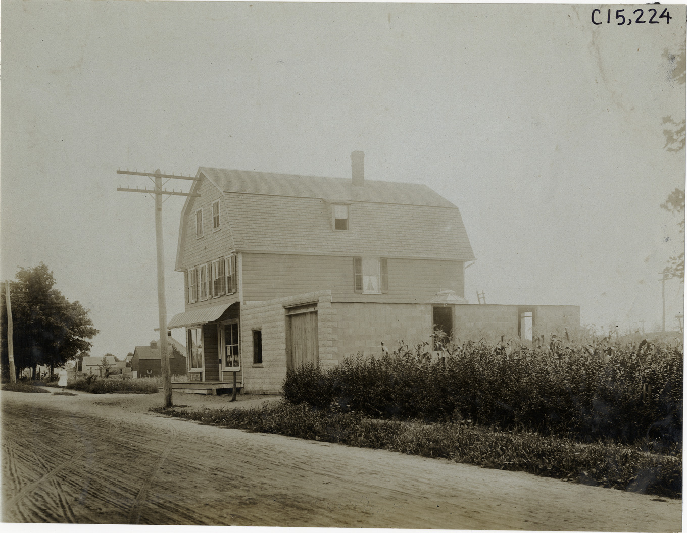 View of commercial building with gambrel roof, the site of the Oldsmobile headquarters, during the 1906 Vanderbilt Cup races on Long Island, New York. Handwritten on back: "Elimination, Oldsmobile headquarters, Vanderbilt, Olds HQ. Races and racing--Vanderbilt Cup races, 1906."