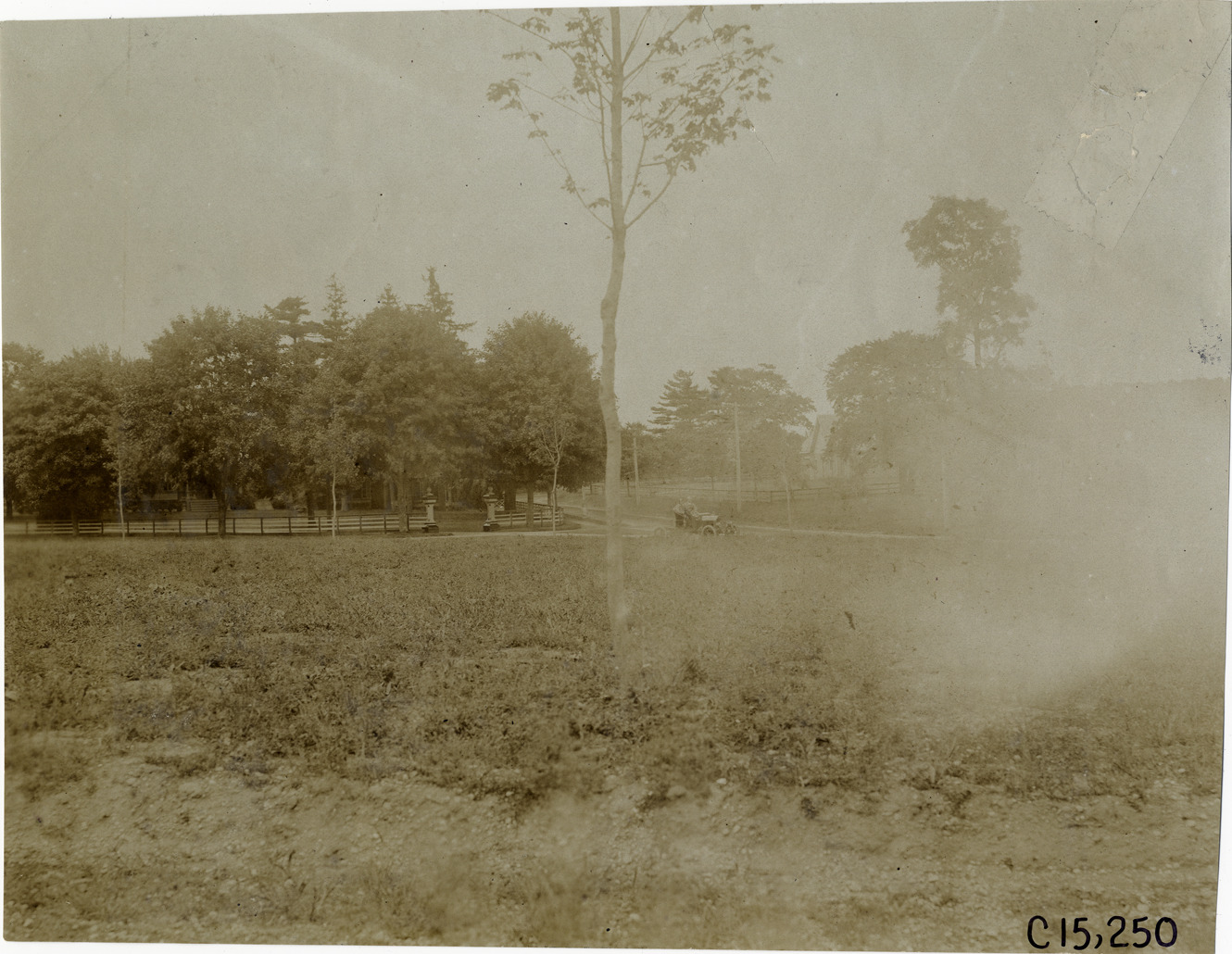Distant view of Ernest Keeler and passenger in Oldsmobile car traveling on Old Westbury Rd., part of the course for the 1906 Vanderbilt Cup races on Long Island, New York. Handwritten on back: "Elimination, Oldsmobile driven by Ernest Keeler. Old Westbury Rd. Races and racing--Vanderbilt Cup races, 1906."