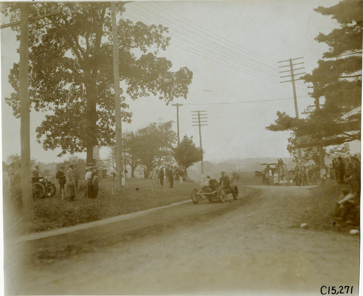 View of E.H. Belden racing Frayer-Miller car no. 16 during the 1906 Vanderbilt Cup races on Long Island, New York. Spectators watch from roadside. Handwritten on back: "Elimination, #16 110 h.p. Frayer-Miller, driven by E.H. Belden. Belden at Albertsons. Races and racing--Vanderbilt Cup races, 1906."