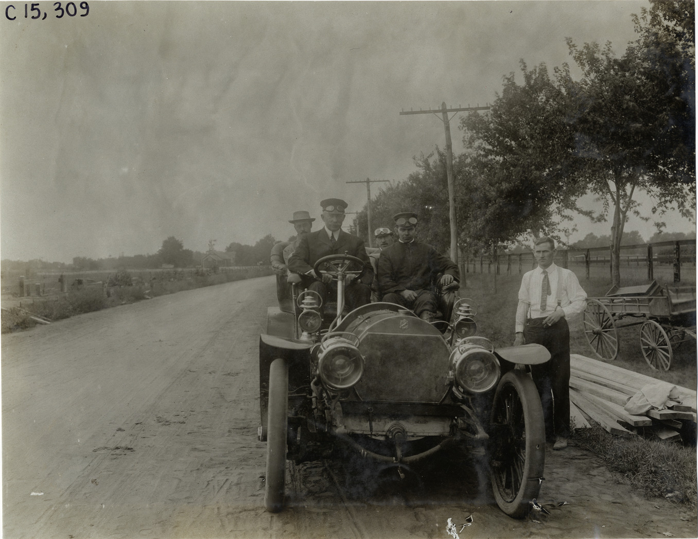 Front view of chairman Jefferson De Mont Thompson and racing officials posing in car during the 1906 Vanderbilt Cup races on Long Island, New York. Man stands next to pile of lumber on roadside; wagon in background. Handwritten on back: "Races and racing--Vanderbilt Cup races, 1906."
