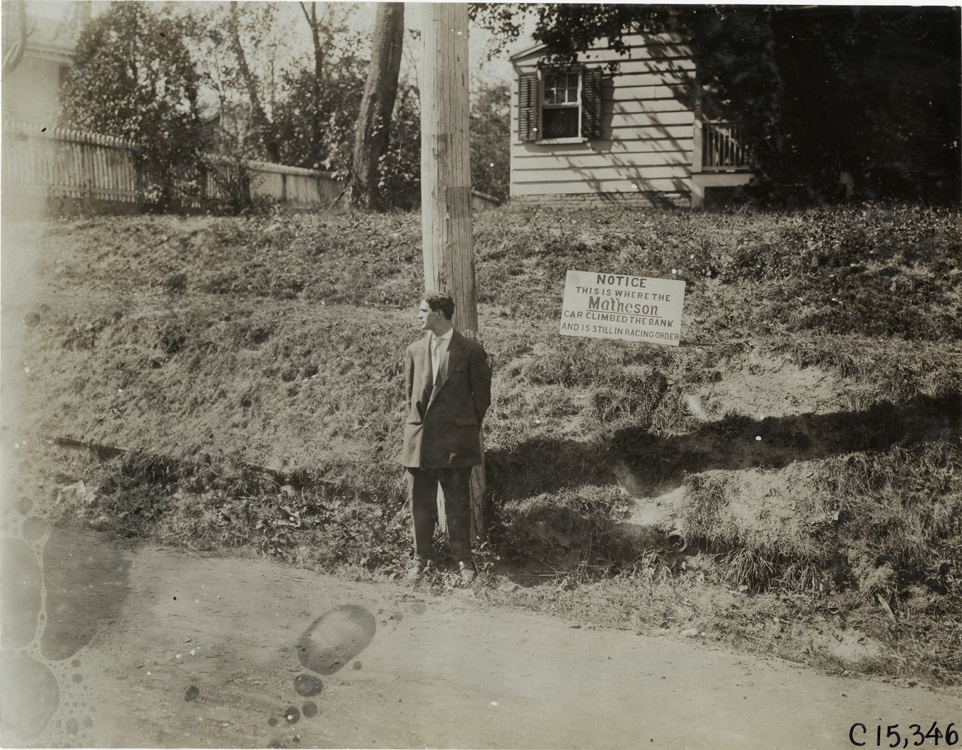 View of man standing in front of utility pole during the 1906 Vanderbilt Cup races on Long Island, New York. Sign on roadside reads: "Notice. This is where the Matheson car climbed the bank and is still in racing order." House in background. Handwritten on back: "Elimination. Races and racing--Vanderbilt Cup races, 1906."