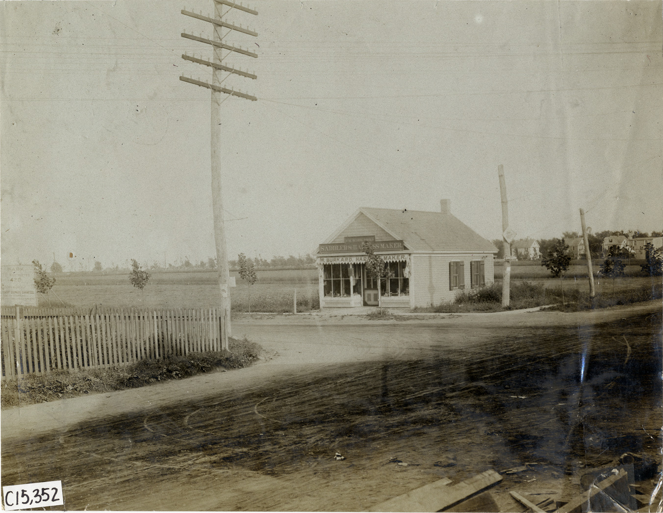 View of M. Burkhard saddlery and harness shop at intersection during the 1906 Vanderbilt Cup races on Long Island, New York. "M. Burkhard, saddlers, harness maker" sign displayed on one-story, wooden-frame building on corner. Handwritten on back: "Elimination. Races and racing--Vanderbilt Cup races, 1906."