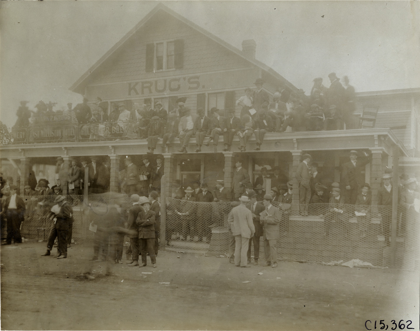 View of spectators on porch and roof of P. Krug's East Williston Hotel during the 1906 Vanderbilt Cup races on Long Island, New York. Handwritten on back: "Races and racing--Vanderbilt Cup races, 1906."