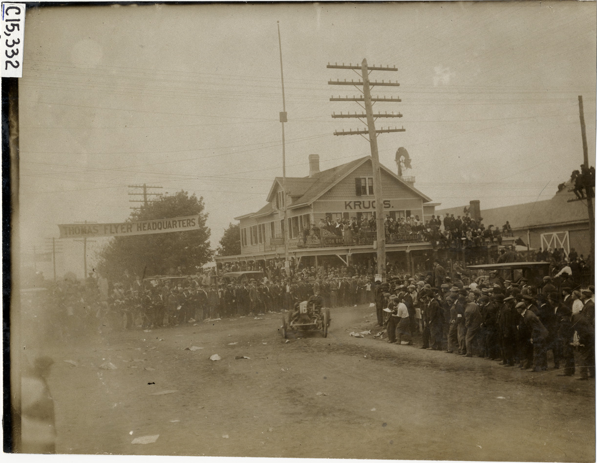 View of E.H. Belden racing Frayer-Miller car no. 16 past spectators during the 1906 Vanderbilt Cup races on Long Island, New York. P. Krug's East Williston Hotel in background. Handwritten on back: "Elimination, #16 110 h.p. Frayer-Miller, driven by E.H. Belden. Races and racing--Vanderbilt Cup races, 1906."