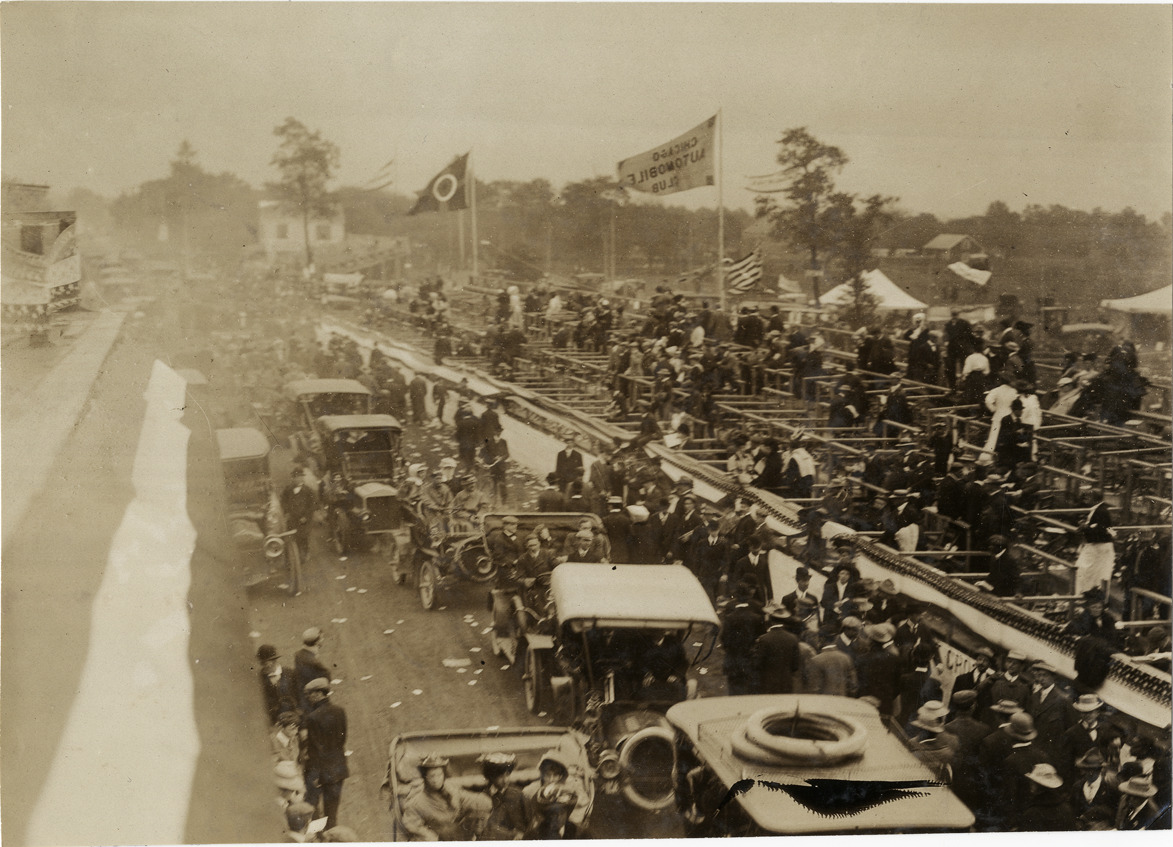 Motorists traveling past grandstand, 1906 Vanderbilt Cup races