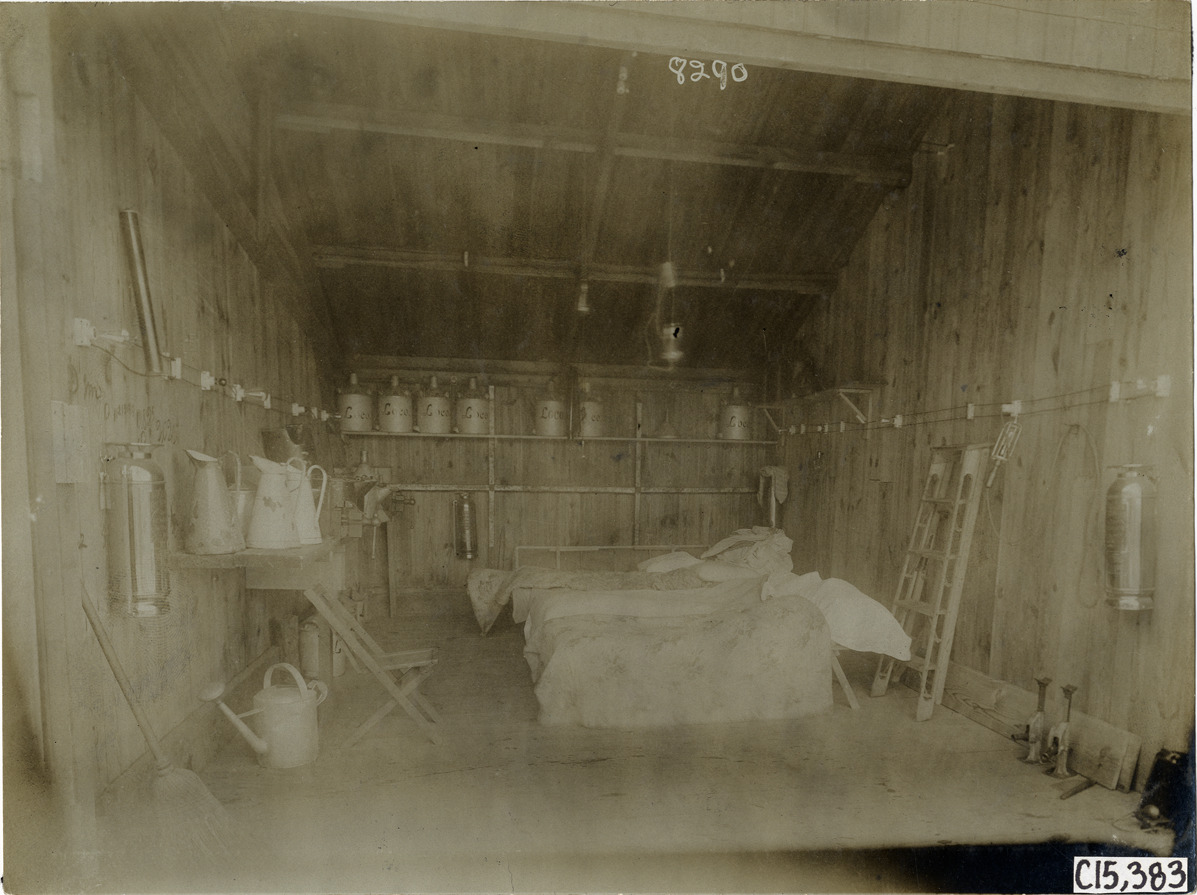 Interior view of Locomobile team men's quarters in wooden-frame building at Lakeville during the 1906 Vanderbilt Cup races on Long Island, New York. Room contains cots, ladder, watering cans and pitchers, broom and fire extinguishers. Handwritten on back: "Locomobile men's quarters at Lakeville. Races and racing--Vanderbilt Cup races, 1906."