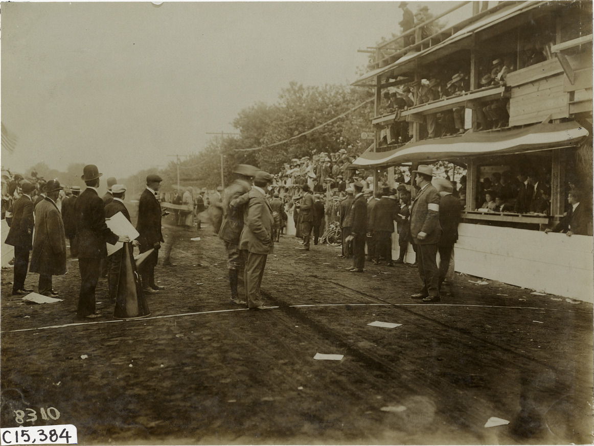 View of several racing officials standing at starting line during the 1906 Vanderbilt Cup races on Long Island, New York. Announcer with megaphone on left. Stamped on back: "Photo by N. Lazarnick, 29 West 42nd Street, New York." Handwritten on back: "Jenatzy on Old Westbury turn. Races and racing--Vanderbilt Cup races, 1906."