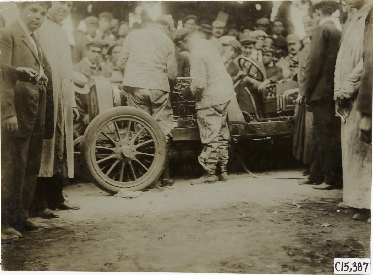 View of driver and mechanic working on car during the 1906 Vanderbilt Cup races on Long Island, New York. Onlookers in background. Stamped on back: "Photo by N. Lazarnick, 29 West 42nd Street, New York." Handwritten on back: "Races and racing--Vanderbilt Cup races, 1906."