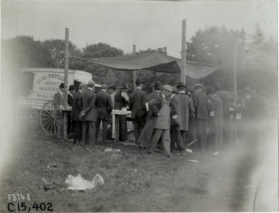 View of men standing around outdoor table having breakfast during the 1906 Vanderbilt Cup races on Long Island, New York. Table is covered with canopy; L.D. Taylor meat market wagon in background. Stamped on back: "Photo by N. Lazarnick, 29 West 42nd Street, New York." Handwritten on back: "Taking an early breakfast. Races and racing--Vanderbilt Cup races, 1906."