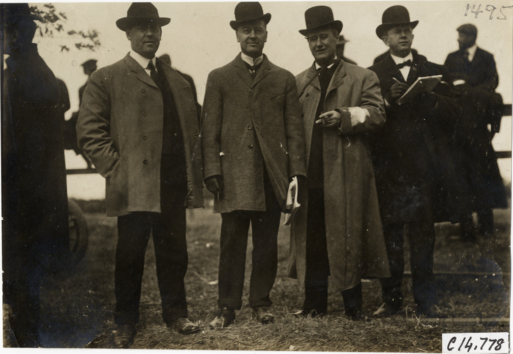 View of group of racing officials during the 1906 Vanderbilt Cup races on Long Island, New York. Handwritten on back: "Races and racing--Vanderbilt Cup races, 1906."