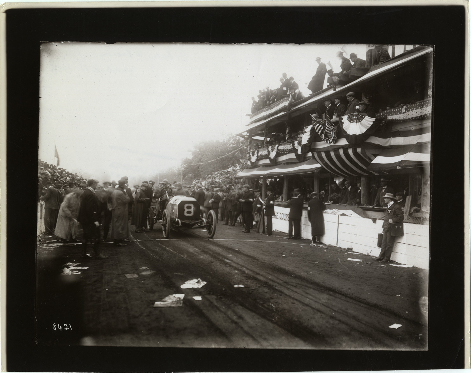 View of Felice Nazzaro and passenger in Fiat car no. 8 at starting line during the 1906 Vanderbilt Cup races on Long Island, New York. Stamped on back: "Photographic illustration by Nick Lazarnick, 230 Park Ave., N.Y." Handwritten on back: "Felice Nazzaro in a Fiat, Vanderbilt, 1906. Races and racing--Vanderbilt Cup races, 1906."