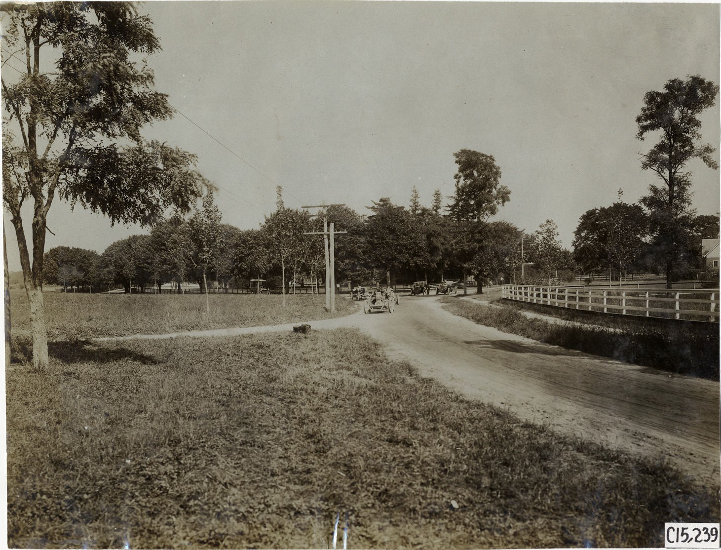 View of three Frayer-Miller cars approaching Westbury hairpin turn, part of the course for the 1906 Vanderbilt Cup races on Long Island, New York. House in background. Handwritten on back: "Elimination, Frayer-Miller team, Westbury hairpin turn. Races and racing--Vanderbilt Cup races, 1906."