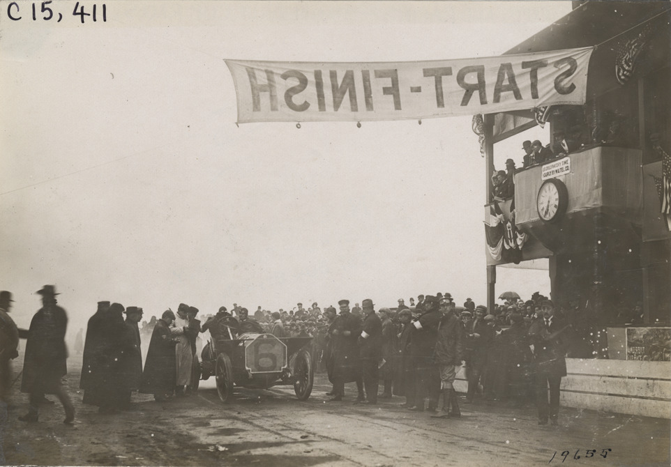 View of driver and passenger in car no. 6 at starting line during the 1908 Vanderbilt Cup races on Long Island, New York. "Start-Finish" banner is suspended overhead; timers' stand on right. Stamped on back: "Photo by N. Lazarnick, 29 West 42nd Street, N.Y., tel. 594 Bryant." Handwritten on back: "Races and racing--Vanderbilt Cup races, 1908."