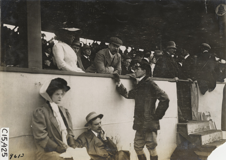 Driver speaking with two spectators in grandstand, 1908 Vanderbilt Cup races
