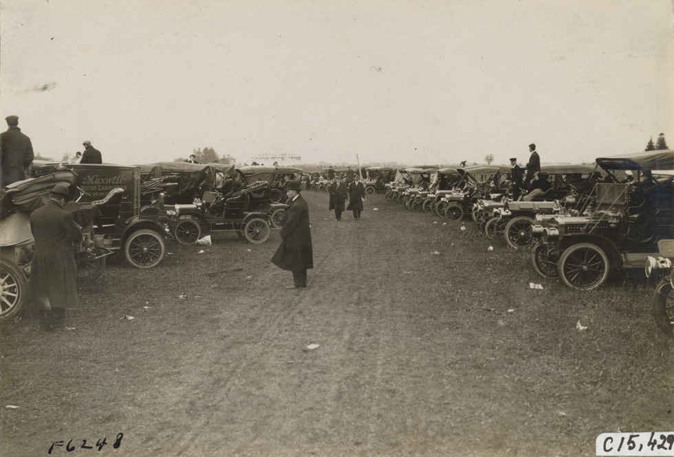 Automobiles parked in field, 1908 Vanderbilt Cup races