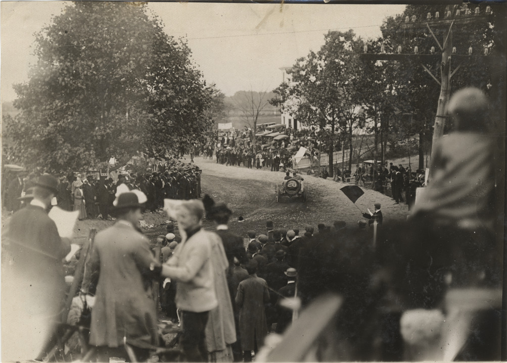 Spectators watching racecar on Flatiron Turn, 1908 Vanderbilt Cup races